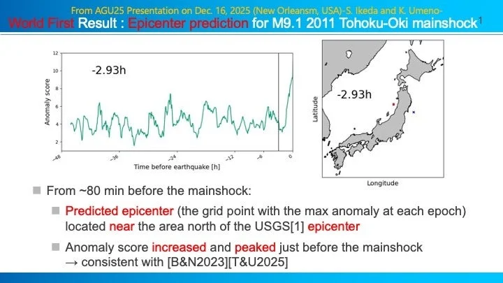 この画期的な研究成果は、2025年12月にアメリカのニューオーリンズで開催された国際会議AGU25で「世界初の震央推定」として発表され、その直後には東京の日本地震予知学会でも招待講演として紹介されたんだ。