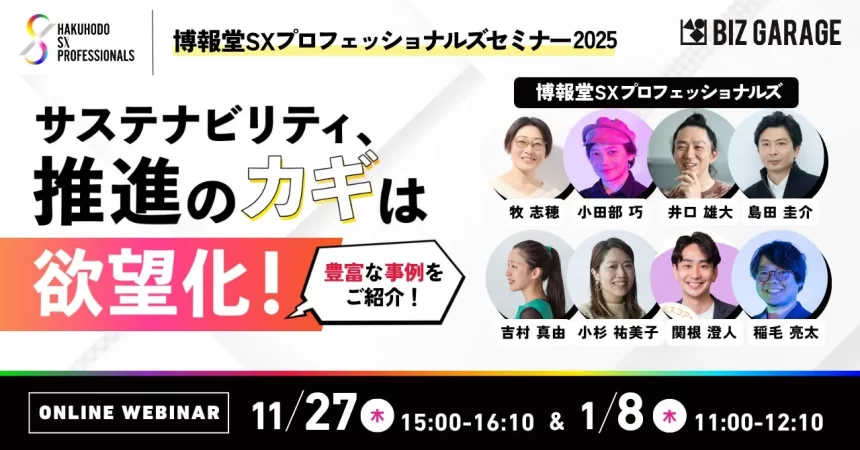多くの企業が「やらなければならない」と感じているサステナビリティの取り組み。これを「やりたい!」に変えるヒントが満載のオンラインセミナー「博報堂SXプロフェッショナルズセミナー2025 サステナビリティ、推進のカギは欲望化!」が、博報堂BIZ GARAGEによって開催されます。