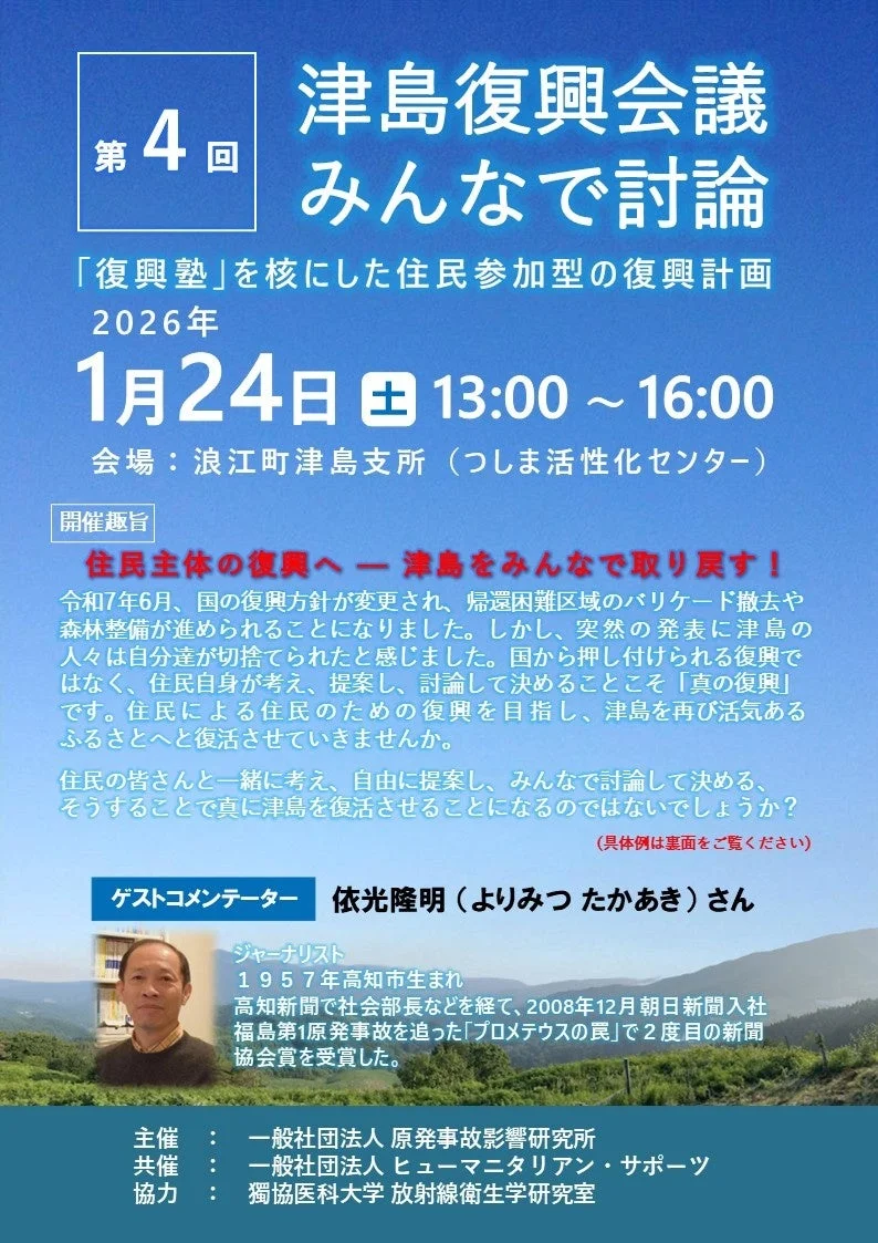 福島県浪江町の津島地区で、住民が主体となって地域の未来を考える「第4回津島復興会議」が2026年1月24日(土)に開催されます。この会議は、国からの一方的な復興計画ではなく、「住民のための、住民による、本当の意味での復興」を目指し、住民一人ひとりが自由に意見を出し合い、共に議論する場として設けられます。