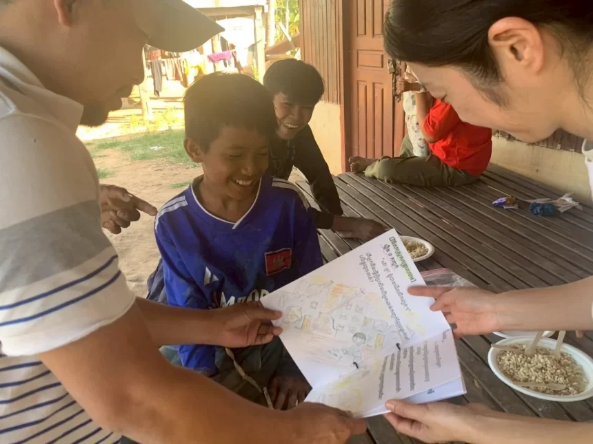 柏の葉中学校の生徒たちは、ICTを活用してクメール語のテキストやポスターなどを制作し、なかよし学園プロジェクトがこれを現地の学習教材として活用しました。生徒たちは講演やワークショップで世界の現状を学び、探究授業の中で「誰に・何を・どう届けるか」まで具体的に設計し、今回のカンボジアでの実践へとつなげたのです。