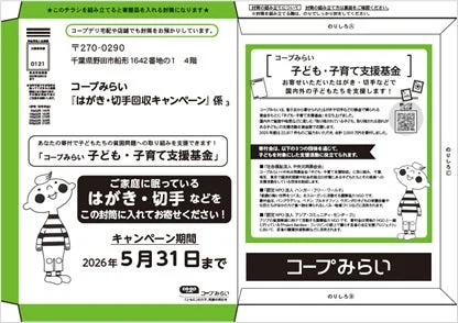 生活協同組合コープみらいは、おうちに眠っているはがきや切手などを活用して、国内外の子どもたちを応援する「はがき・切手回収キャンペーン」を2026年1月12日(月)から5月31日(日)まで開催しています。