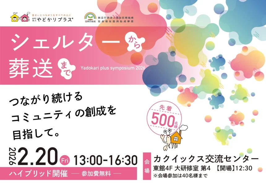 「住まいとつながりをすべての人に。」をビジョンに掲げるNPO法人やどかりプラスが、2026年2月20日にシンポジウムを開催します。このシンポジウムは、鹿児島の会場とウェビナーによるハイブリッド形式で行われ、参加費は無料、先着500名が対象です。