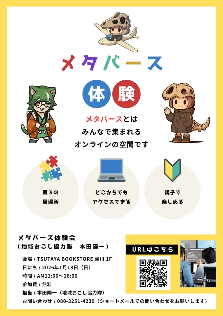 めたほんださんは、「滝川のこどもたちに、『もうひとつの居場所』をつくりたい——その第一歩が今回のメタバース体験会です。ゲームではなく、安心して集まれるオンラインの広場として、親子で気軽に未来の居場所づくりを体感してもらえたらうれしいです」とコメントしています。