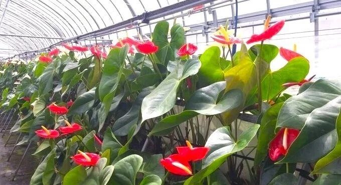 参加者と登壇者、学生による交流会も行われるほか、ビニールハウスで栽培されたアンスリウムの生花展示や、ポリエステル媒地を使用したアンスリウム栽培用ビニールハウスの自由見学もできます。