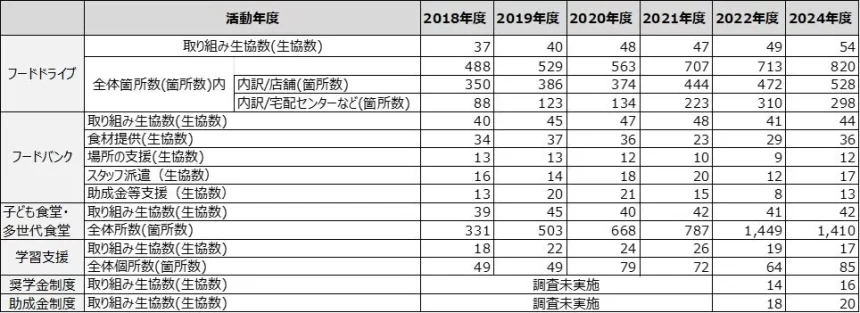 活動実績,データ,表,統計,フードドライブ,フードバンク,子ども食堂,多世代食堂,学習支援,奨学金制度,助成金制度,生協数,箇所数,年度別推移