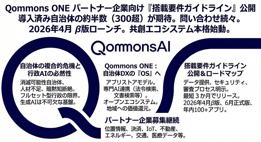 2026年末までに1,200自治体、80万人の職員への展開が計画されているQommonsAIを基盤とするQommons ONEは、自治体DXの「OS(オペレーティングシステム)」となることを目指しています。