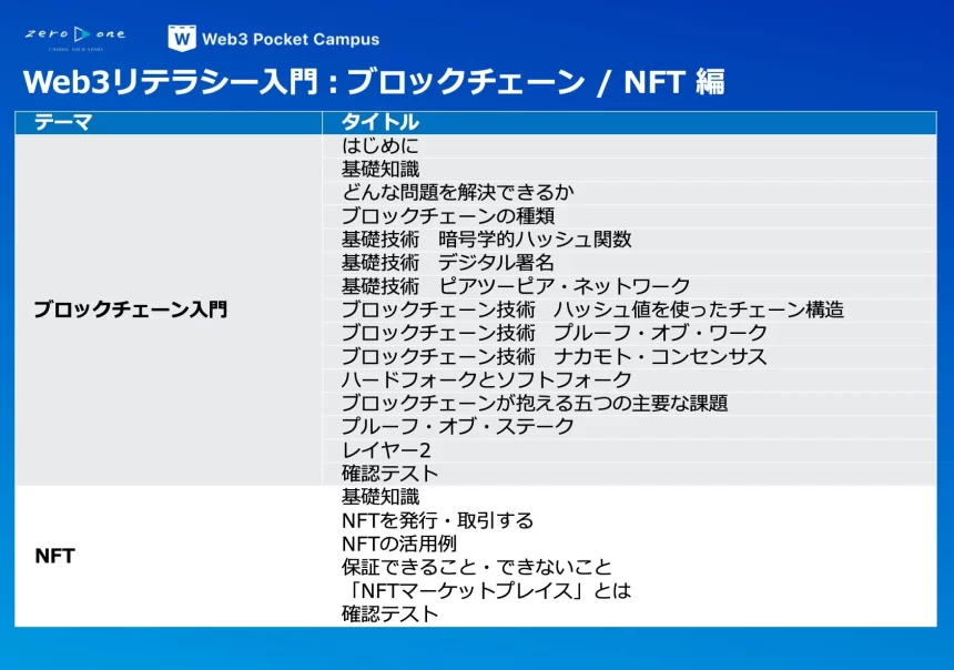 このような背景から、株式会社zero to oneと野村證券株式会社が共同で、オンライン教材「ビジネス活用のためのWeb3:ブロックチェーン、暗号資産/ステーブルコイン、メタバースまで」を開発しました。