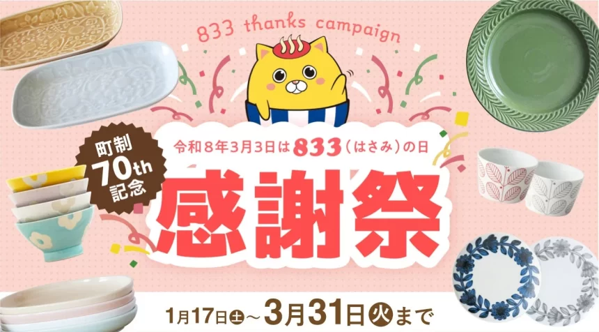 長崎県波佐見町は、令和8年3月3日の「833(はさみ)の日」と町制施行70周年を記念して、「833の日感謝祭」を波佐見町ふるさと納税で実施します。この取り組みは、令和7年10月のふるさと納税制度改定(ポイント付与の廃止)によって生じる寄附の年末一極集中を防ぎ、波佐見焼の「生産平準化」を目指すものです。