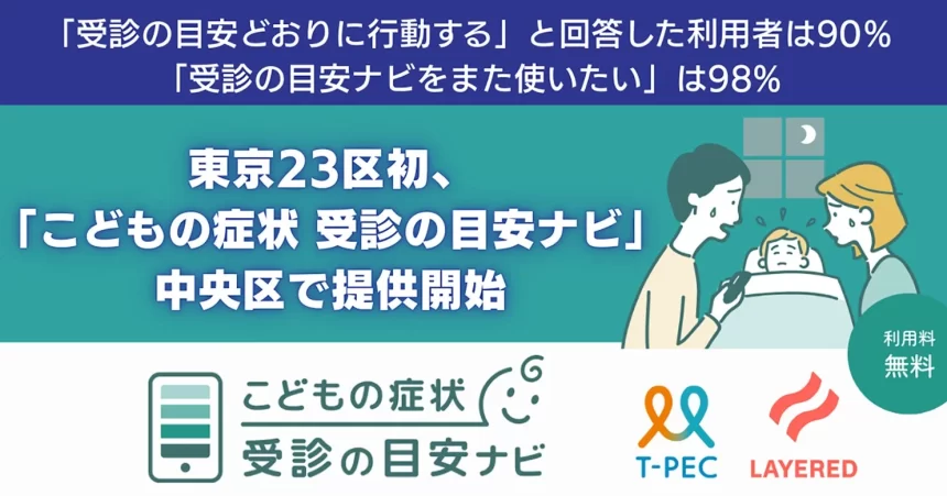 このような状況を背景に、ティーペックは子育て中の保護者の不安を軽減し、医療機関の適正受診を支援するため、「こどもの症状 受診の目安ナビ」を開発しました。2025年6月から中央区でトライアル運用が行われ、その結果を踏まえて2026年1月からの本格導入が決定しました。