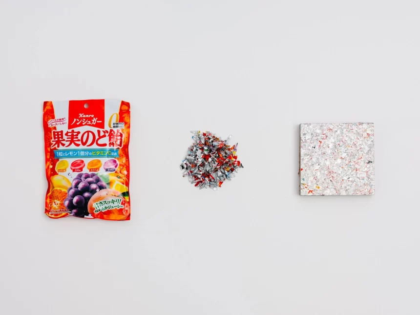 2025年1月から12月末までの1年間で、REMAREはカンロから2,500kg以上の廃棄包材を素材として買い取り、マテリアルリサイクルを実施しました。このうち約1,300kgは、すでにオフィスや大学、ホテル、さらには個人宅の内装空間において、テーブルやベンチといった什器として導入されています。廃棄物を再生するだけでなく、実際に使われ、長期的に活用される場へとつなげることで、資源循環のプロセスが具体的な形として広がっています。