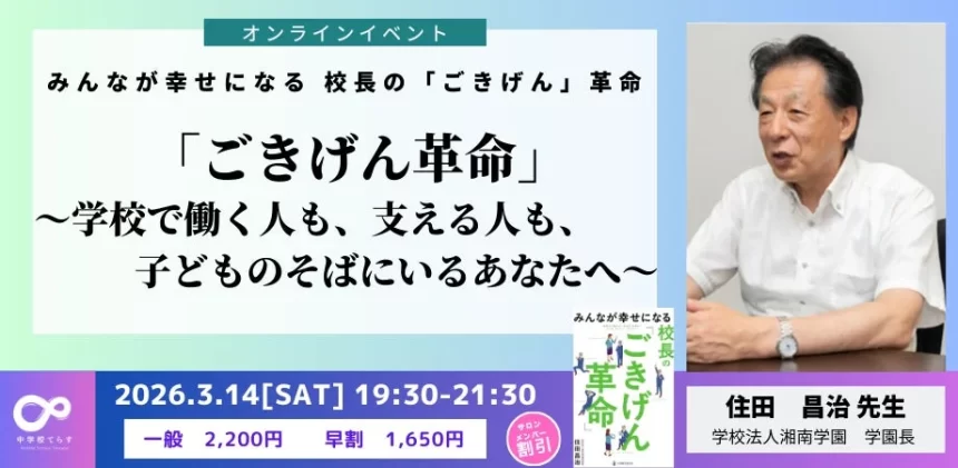 今回のイベントでは、2026年1月に『みんなが幸せになる校長の「ごきげん革命」』を出版されたばかりの住田昌治先生が講師として登壇します。住田先生は、映画「夢みる校長先生」にも出演され、現在は学校法人湘南学園の学園長として活躍されています。全国各地で管理職研修の講師を務めるなど、その活動は多岐にわたります。