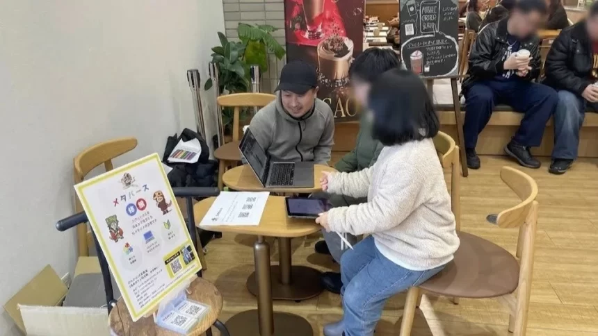 スターバックス店内で、多くの客が過ごしている賑やかな風景。手前では、男性が子どもたちにノートパソコンやタブレットを使って何かを説明しており、傍らには「メタバース」の体験会らしき案内板が立てられている
