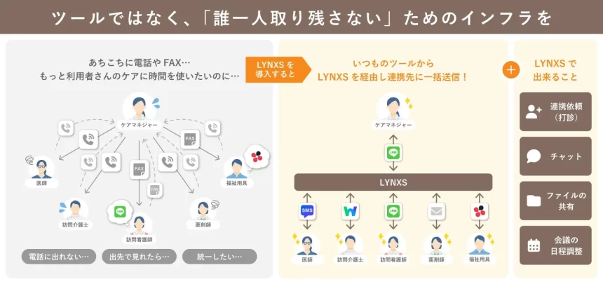 LYNXSは、普段の地域包括ケアだけでなく、自治体の重層的支援体制や災害時の情報連携にも対応できる、まさに社会のインフラを目指しています。