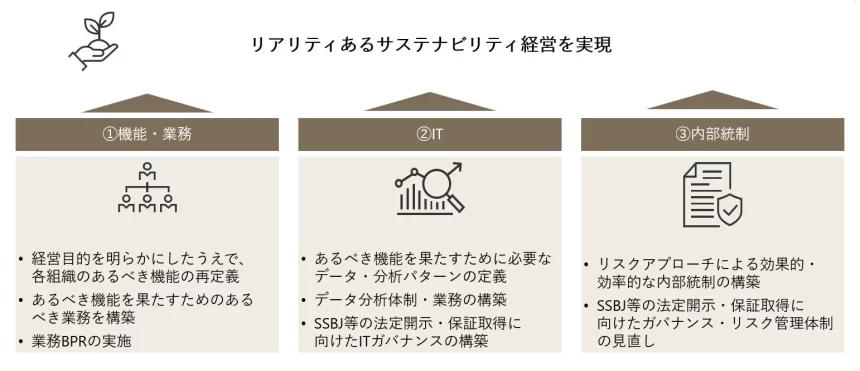 これらの支援によって、成果につながる指標設計と効果検証を通じて、投資や見直し判断の質を高めることができるでしょう。また、手作業やExcel中心の運用を減らし、データやIT(必要に応じてAI)を活用した効率的な業務運用も実現します。さらに、作成過程の見える化や証拠の整備により、開示情報の信頼性を高め、将来の基準改訂や保証範囲の拡大にも対応しやすい汎用的な設計で、継続的な拡張や横展開も可能になります。