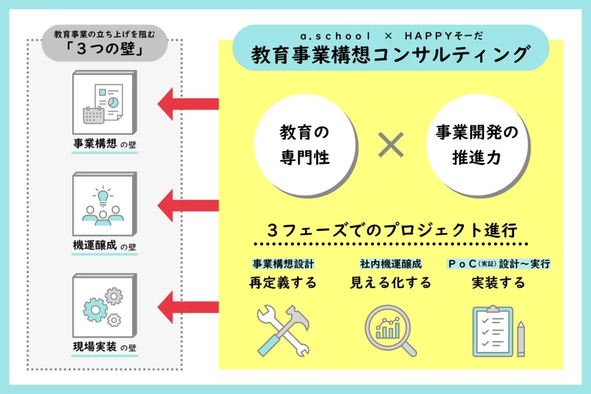 「新しい教育事業を始めたいけど、何から手をつけていいか分からない…」「既存の教育プログラムをもっと良くしたい!」そんな企業や自治体のみなさん、朗報です!探究・創造的な学びを推進する株式会社a.schoolと、教育事業開発を支援する合同会社HAPPYそーだが、タッグを組んで「教育事業構想コンサルティング」の協働提供をスタートしました。