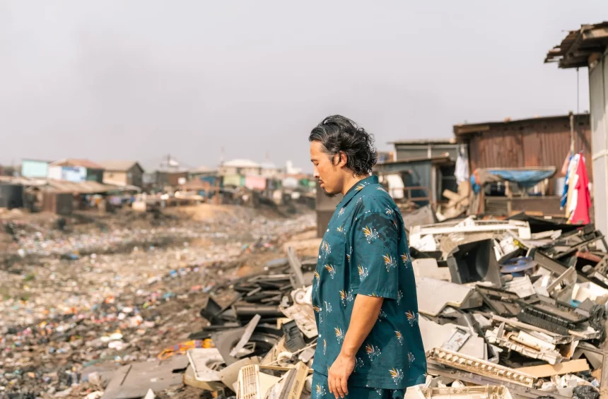 電子廃棄物集積地に立つ男性