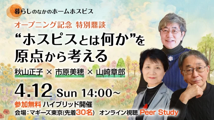 この特別鼎談は、全10回にわたるシリーズ企画「暮らしのなかのホームホスピス」のオープニング記念です。このシリーズでは、全国の実践者がそれぞれの地域で生まれた「最期のかたち」を語ります。毎週水曜19:30よりPeer Studyにてライブ配信され、初回は2026年4月15日(水)です。