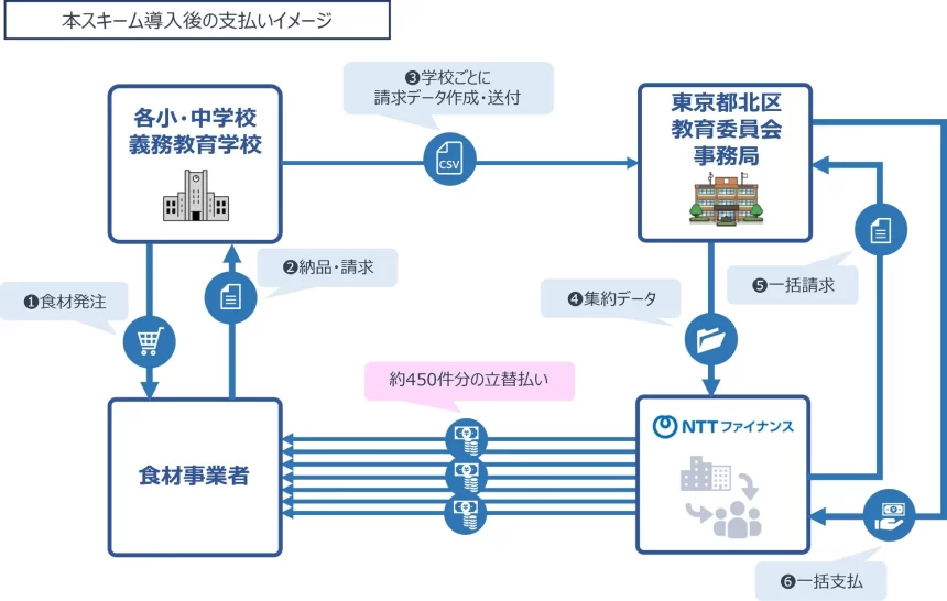 そこで東京都北区は、限られた体制でも安定して運用できる業務設計と、会計処理の適正性を保ちつつ、確認・集計・照合のプロセスを標準化できる仕組みを重視。NTTファイナンス株式会社が提供する「食材調達費支払業務委託スキーム」の導入を決定しました。このサービスは2026年5月1日から利用開始される予定です。