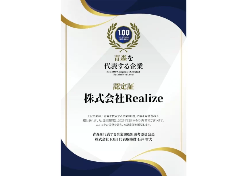 青森県弘前市に本社を置く株式会社Realizeが、地方創生メディア「Made In Local」が選定する「地域を代表する企業100選」に選ばれました!なんと、設立からたった約2年半での快挙だそうです。これは、独自のビジネスモデルと設立以来の急成長が評価された結果とのこと。