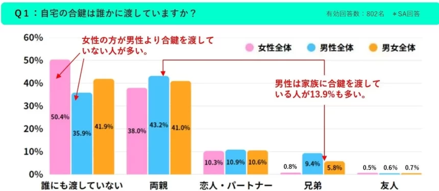 調査によると、自宅の合鍵を誰かに渡している人は全体の約6割にのぼります。最も多いのは「両親」(41.0%)で、次に「恋人・パートナー」(10.6%)、「兄弟」(5.8%)と続きました。注目すべきは男女間の意識差で、「誰にも渡していない」と回答した女性は50.4%に達し、男性を約15%も上回っています。男性は家族に鍵を託す傾向が強いのに対し、女性はひとり暮らしにおける「個の自立」や「プライバシー」を重視していることがうかがえますね。