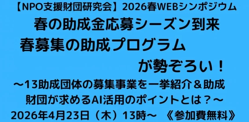 実際の助成事例を通して、助成財団がどのような企画を評価し、NPOに何を期待しているのかを深掘りします。例えば、公益財団法人キリン福祉財団と認知症行方不明者と家族・支援者連絡会の事例、公益財団法人トヨタ財団と社会福祉法人呉竹会の事例が紹介される予定です。