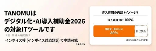 『TANOMU』の導入費用が、この補助金を活用することで、最大4/5の補助率で支援される可能性があります(補助金額や企業規模によって補助率は変わります)。さらに、クラウド利用料も最大2年分も支援されるのは、かなりのメリットですよね。