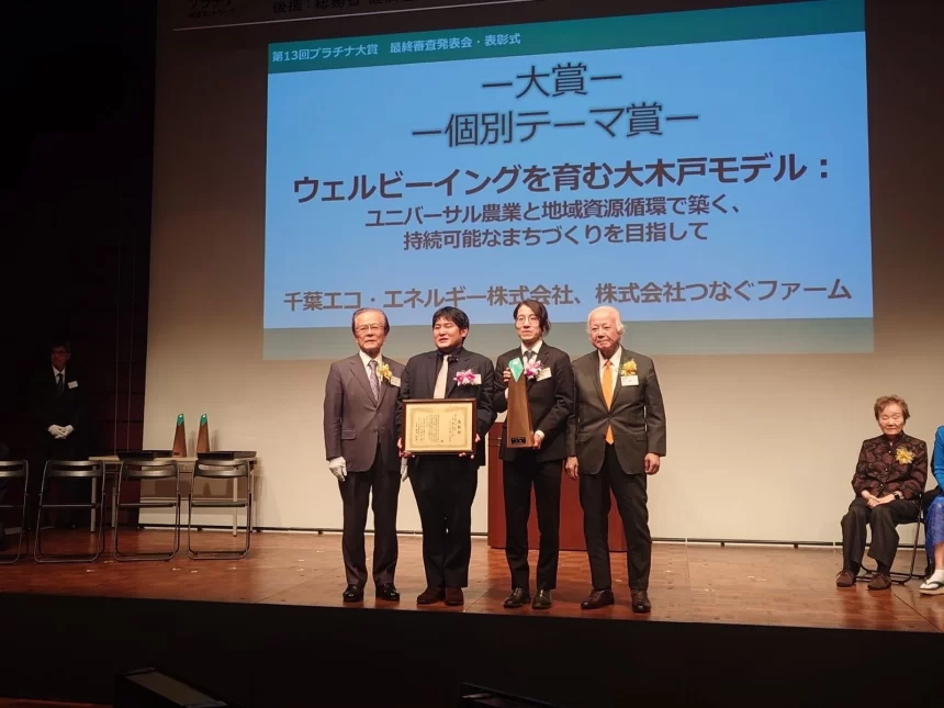 千葉大学発のベンチャー企業である千葉エコ・エネルギー株式会社と、持続可能な農業を実践する農業法人株式会社つなぐファームが、このたび「第13回プラチナ大賞」において「大賞・個別テーマ賞」を受賞しました。