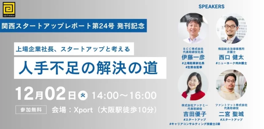 NPO法人生態会が主催する『関西スタートアップレポート第24号』の発刊を記念したイベントが、2025年12月2日(火)にXportで開催されることになったよ。今回のイベントでは、「人手不足の解決の道」をテーマに、関西のスタートアップが直面する課題と、その解決策について深く議論するんだ。