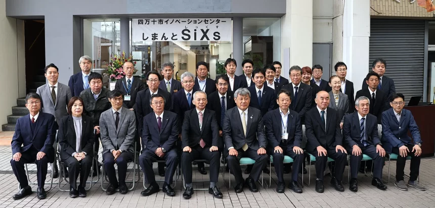 四万十市イノベーションセンター「しまんとSiXs」の前で撮影された、多数のビジネスパーソンによる集合写真です。スーツ姿の男女が整列し、カメラに向かってポーズをとっています。