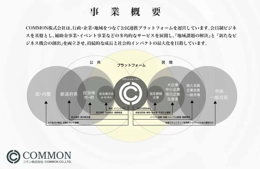 COMMON株式会社は、「共創による地域と企業の持続的な価値づくり」をミッションに、全国の自治体・企業・市民団体と連携した公民共創型のまちづくりや防災・観光・教育分野のプロジェクトを企画・運営するソーシャルビジネス企業です。公民連携の会員制プラットフォーム事業や企業版ふるさと納税を活用した地域活性化、移動型アンテナショップ「コモンズマルシェ」など、民間のノウハウを活かした地域課題の解決に取り組んでいます。各地の自治体との災害時連携協定や、防災イベント・フォーラムの企画を通じて、企業間連携による災害対応ネットワークづくりも推進。地域・企業・個人が“つながり合う”仕組みを構築し、未来志向の共創社会を目指しています。
