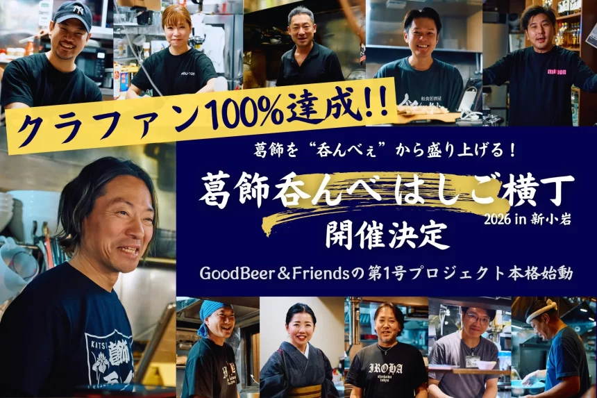 GoodBeer&Friends株式会社が手掛ける「葛飾呑んべクラフトプロジェクト」が本格的にスタートしました!このプロジェクトでは、地域に新たな賑わいと楽しさを生み出すことを目指しており、なんとクラウドファンディングでは目標金額100%を達成。葛飾区を「呑んべぇ」のまちとしてさらに盛り上げる、期待のはしご酒イベント「葛飾呑んべはしご横丁2026 in新小岩」の開催も決定しています。