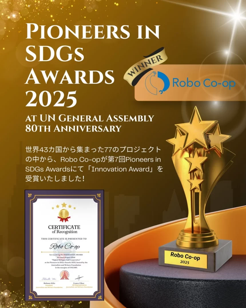 今年は43か国から77のプロジェクトが選考対象となり、Robo Co-opは国境を越えた包摂的イノベーションとデジタル協働の推進における先駆的な取り組みが高く評価され、「Innovation Award 2025」を受賞するに至りました。これは、Robo Co-opが避難民の専門人材や社会的に周縁化された人々を、意味のある経済的機会へとつなぐ努力が確かなものであることを示しています。