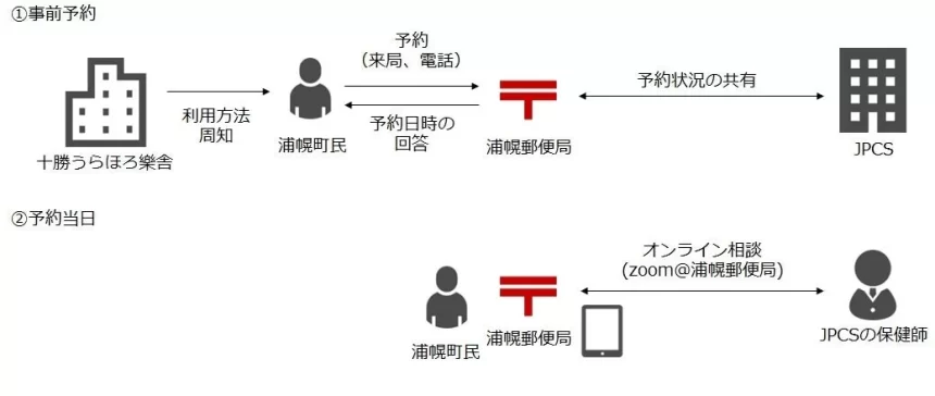 相談は、浦幌郵便局に設置された端末を使ってオンラインで行うことができるよ。予約は浦幌郵便局に来局するか、電話でできるんだって。しかも、利用料金は協力法人の一般社団法人十勝うらほろ樂舎が負担してくれるから、無料で利用できるのは嬉しいポイントだね!