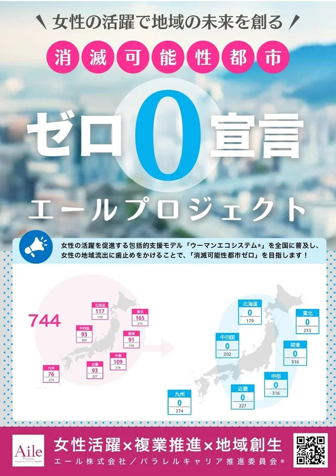 この課題を解決するため、エール株式会社が提唱するのが、包括的支援モデル「ウーマンエコシステム®」です。これは、女性の活躍を促進し、「消滅可能性都市ゼロ」を目指す取り組みです。