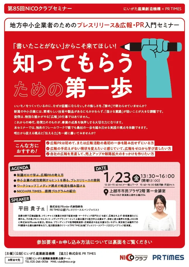 そんな現状を変えたいあなたにぴったりのセミナーが、公益財団法人にいがた産業創造機構(NICO)主催で開催されます。広報PRが初めての方や、今の広報活動に手応えを感じていない方、そして自社の広報を見直して売上アップや販路拡大につなげたいと考えている方におすすめです。