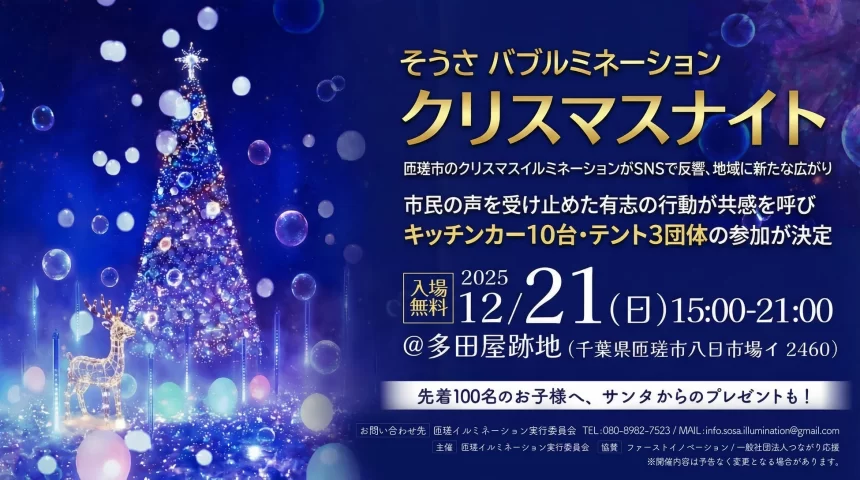 千葉県匝瑳市で2025年12月21日(日)に開催される「そうさ バブルミネーション クリスマスナイト」が、SNS上で大きな注目を集めています。