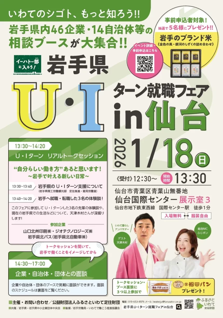 令和8年1月18日(日)に、仙台国際センター展示室3で「岩手県U・Iターン就職フェアin仙台」が開催されます。このイベントは、仙台圏の学生さんや社会人の方々が岩手県内の企業と出会い、U・Iターン就職を考えるきっかけとなることを目指しています。