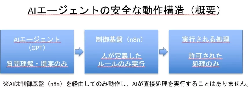 このAIエージェントは、ワークフロー制御基盤である「n8n」というシステムを通って動きます。AIが直接システムを操作することはなく、人間が事前に決めたルール通りの処理だけを実行するように設計されているので、とっても安全です。