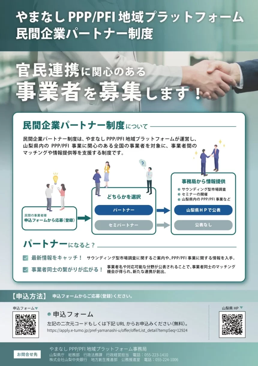山梨県と株式会社山梨中央銀行が事務局を務める「やまなしPPP/PFI地域プラットフォーム」が、官民連携事業に関心のある民間企業パートナーを募集しているよ!この制度は、山梨県内の公共施設の整備や運営に、企業さんの力をもっと活かすためのものなんだ。